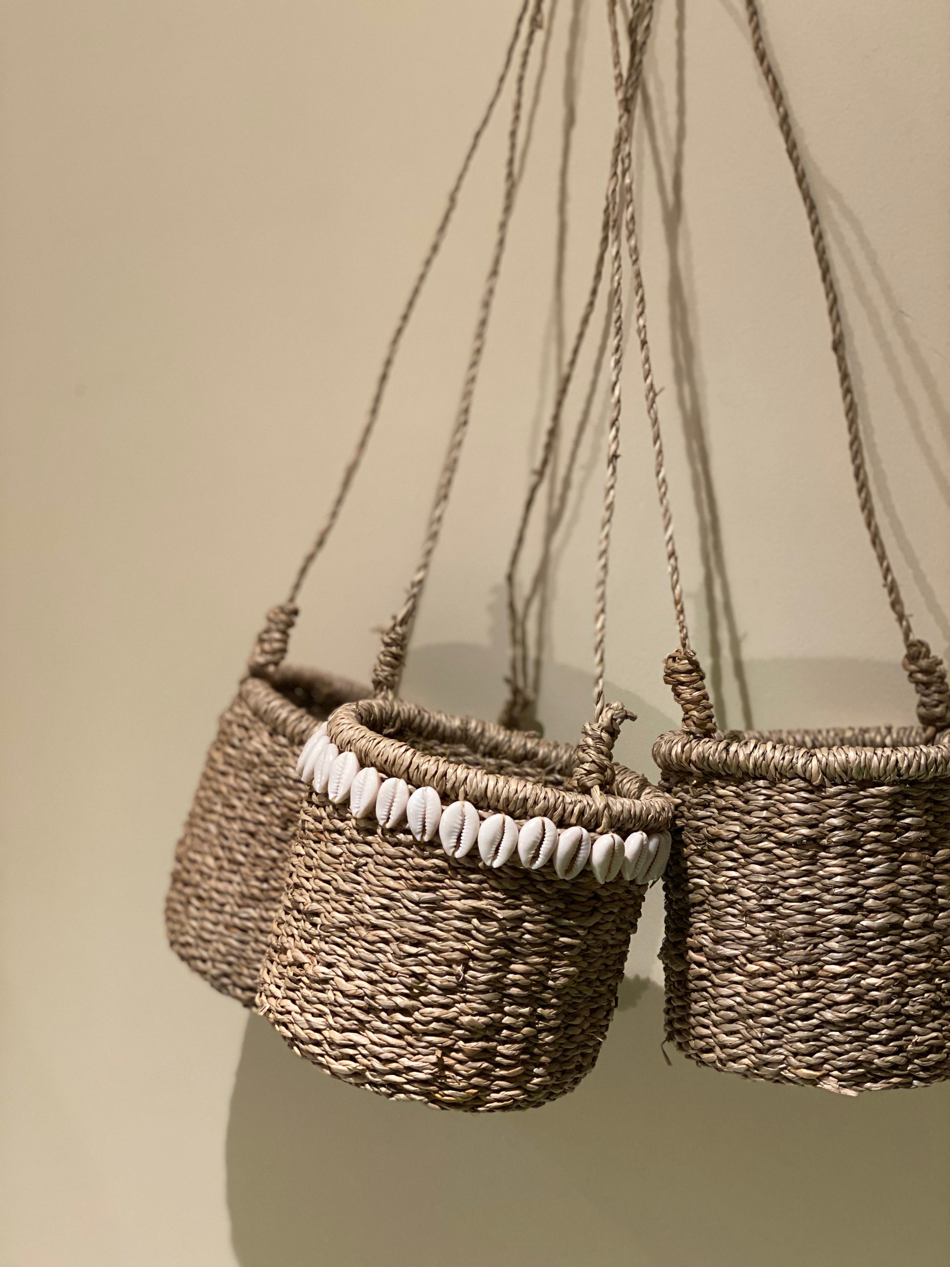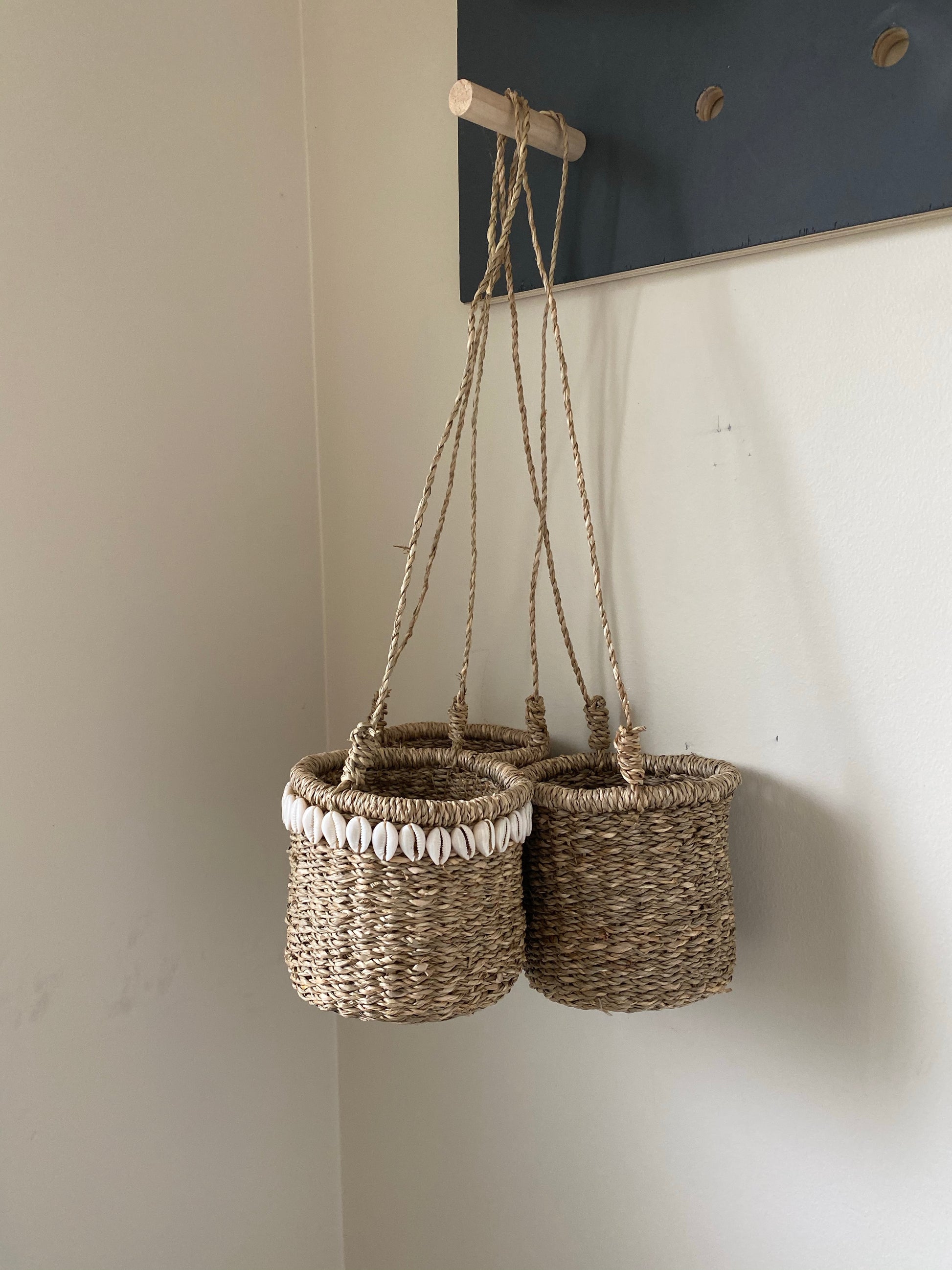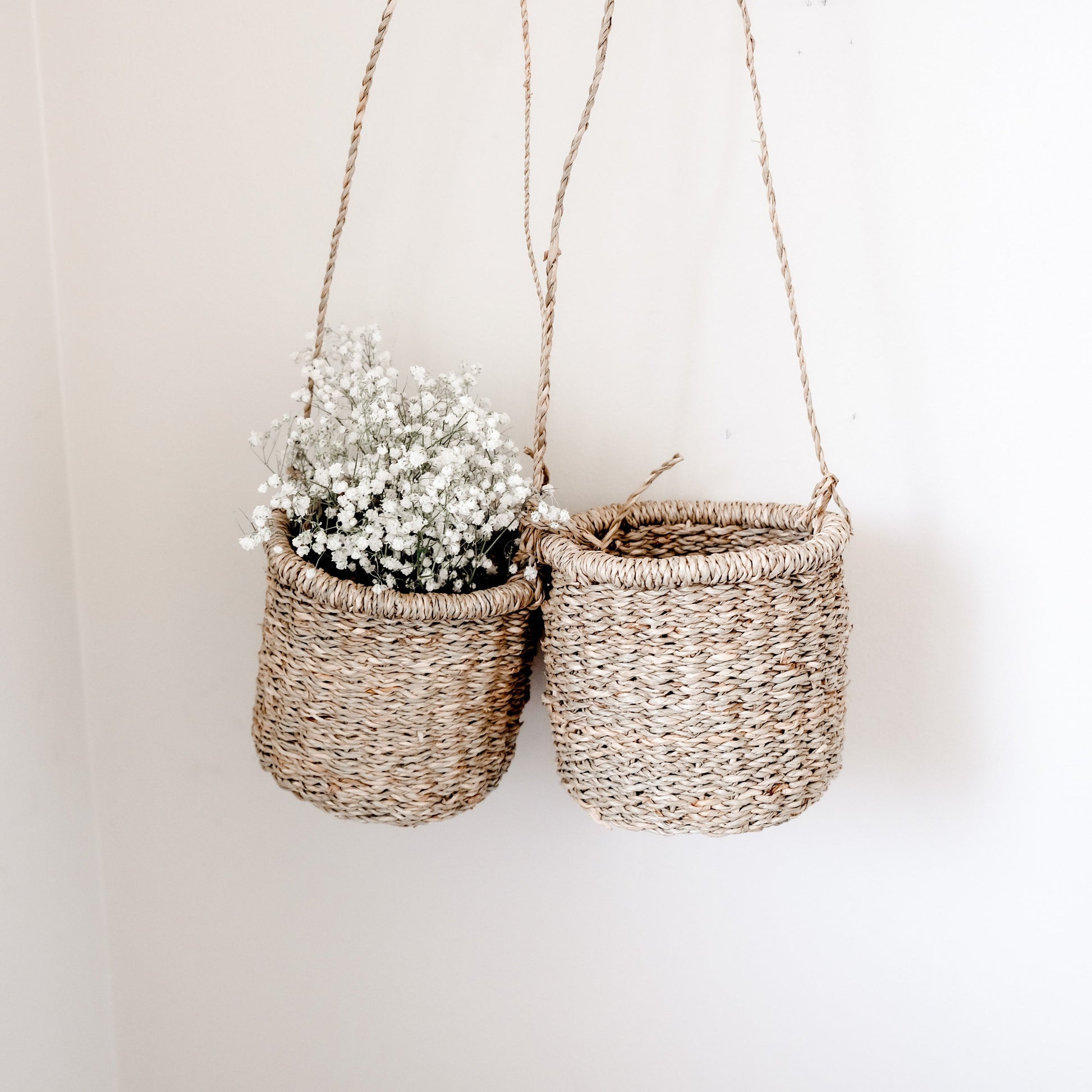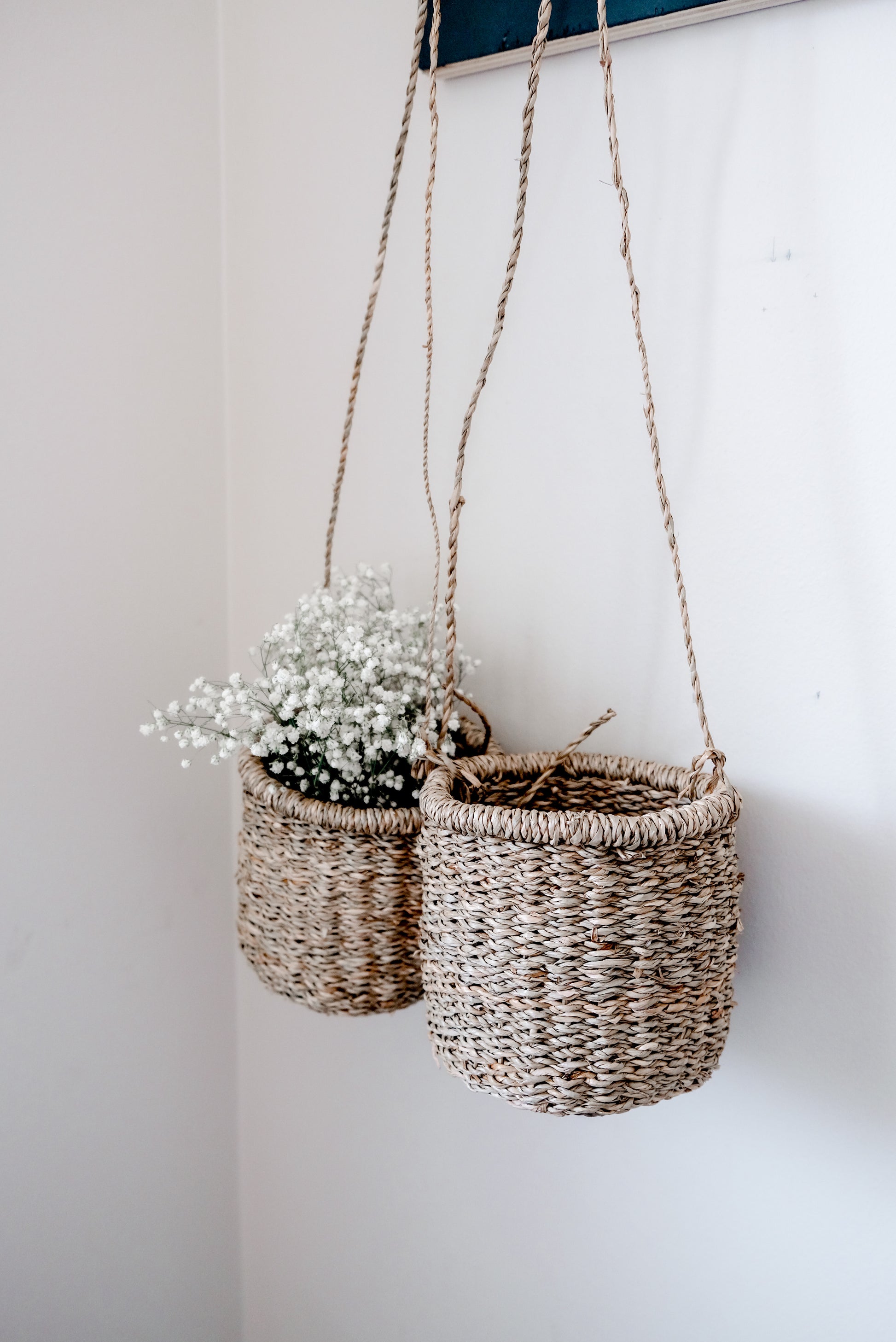 Beautiful and useful handmade hanging basket for your plant or small items. This basket is made of seagrass, carefully woven by hand and finished with a woven handle.
